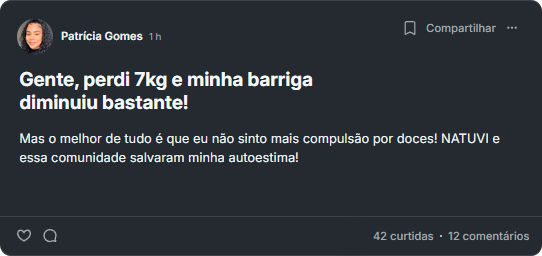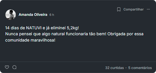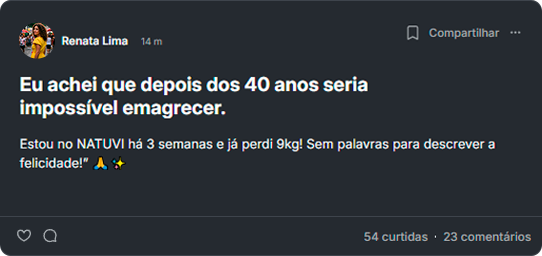 “Comprei o Ozempic, mas logo no primeiro dia não me adaptei, passei mal e decidi parar. Então uma amiga me indicou o Natuvi e disse que conseguiu ótimos resultados sem os efeitos ruins. Resolvi testar e já perdi 4kg em três semanas!"